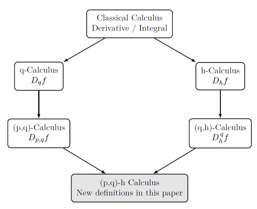 Definition 2. Let \(f\) be a continuous function defined on an interval \(I\) of real line \(\mathbb{R}\). Then for \(0<q<1\), the following expression [19]: \[\label{21} \mathcal{D}_{q}f(t)=\frac{f(qt)-f(t)}{(q-1)t}, \tag{2}\] is called \(q\)-derivative of the function \(f(t)\). For \(h \in \mathbb{R}\), the following expression [19]: \[\label{23} \mathcal{D}_{h}f(t)=\frac{f(t+h)-f(t)}{h}, \tag{3}\] is called \(q\)-derivative of the function \(f(t)\). For \(0<q<1\) and \(p\leq1\), the following expression [6]: \[\label{25} \mathcal{D}^{p}_{q}f(t)=\frac{f(qt)-f(pt)}{(q-p)t}, \tag{4}\] is called \((p,q)\)-derivative of the function \(f(t)\). For \(0<q<1\) and \(h \in \mathbb{R}\), the following expression [12]: \[\label{24} \mathcal{D}^{q}_{h}f(t)=\frac{f(q(t+h))-f(t)}{(q-1)t+qh}, \tag{5}\] is called \((q,h)\)-derivative of the function \(f(t)\).